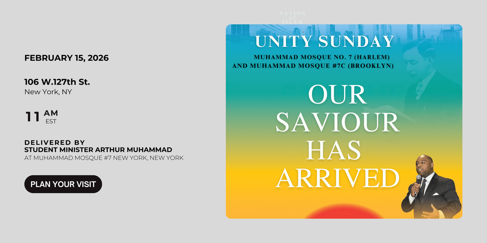 The historical Muhammad Mosque No. 7, located in the heart of Harlem, New York City, is the Eastern Regional headquarters of the Nation of Islam dedicated to spiritual advancement under the guidance of Allah (God), the teachings of the Most Honorable Elijah Muhammad, and His representative the Honorable Minister Louis Farrakhan, whose wisdom and leadership lays the foundation for spiritual, moral, and social development within our communities. This historic institution serves as a platform for disseminating this truth and applying the principles taught to the challenges faced by our community in the ongoing fight for Freedom, Justice, and Equality. All of our people who wish to experience the word of Allah (God) as it relates to our present-day condition and struggle for Freedom, Justice, and Equality are invited to reclaim their own and join the Nation of Islam.