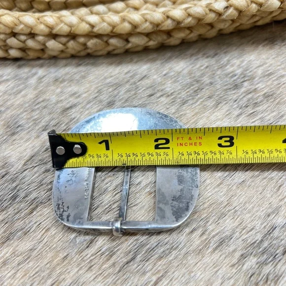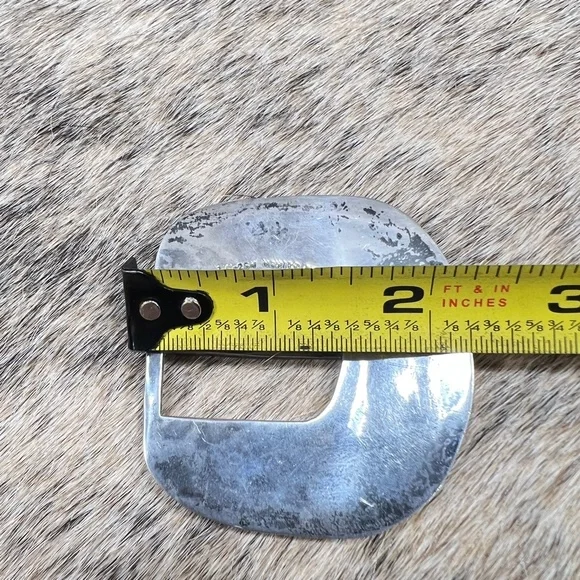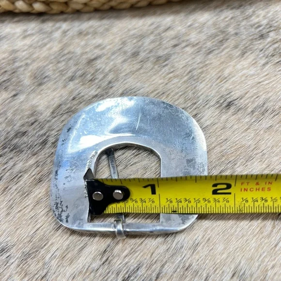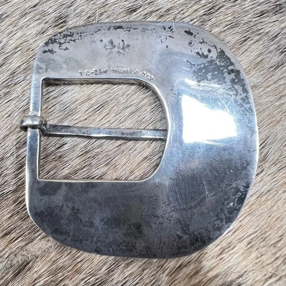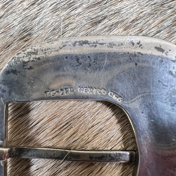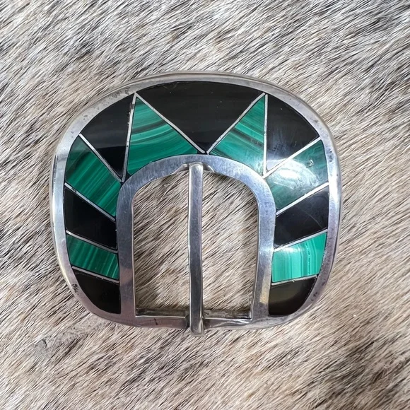 This is a stunning belt buckle! Marked Sterling, made in Mexico, very much in a Zuni style with inlayed onyx and malachite. Jewelry grade. Larger belt buckle with a modern look. In excellent condition. On the right side of the buckle on one of the malachite portions, it looks like a nick but isn't. It is a natural inclusion to the stone. Will fit a 1" belt. Buckle measures 2 2/8" wide by 2 1/4" tall.