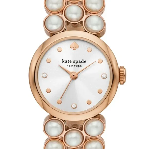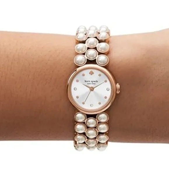 Kate Spade Monroe Crystal Accent Faux-Pearl Rose-Tone Watch with White Dial (Model: Ksw1784) NIB NWTYou'll love the layers of elegance in this stunning ladies' Kate Spade Monroe rose-toned watch with a triple-row faux-pearl bracelet. The white sunray dial features three rose-toned hands and crystal and rose-toned dot markers. 24.0mm rose ion-plated stainless steel case with mineral crystal Japanese quartz movement keeps accurate time. The rose-toned stainless steel bracelet features three rows of fauxpearls and secures with a fold-over clasp. Water resistant to 30 meterItems are retail store purchases and may have been handled or tried on by store customers Prior to sending, photos are taken of item with shipping label and a zip tag attached to represent the item purchased.