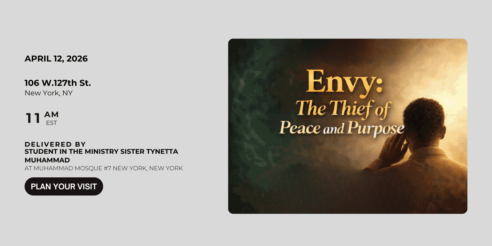 The historical Muhammad Mosque No. 7, located in the heart of Harlem, New York City, is the Eastern Regional headquarters of the Nation of Islam dedicated to spiritual advancement under the guidance of Allah (God), the teachings of the Most Honorable Elijah Muhammad, and His representative the Honorable Minister Louis Farrakhan, whose wisdom and leadership lays the foundation for spiritual, moral, and social development within our communities. This historic institution serves as a platform for disseminating this truth and applying the principles taught to the challenges faced by our community in the ongoing fight for Freedom, Justice, and Equality. All of our people who wish to experience the word of Allah (God) as it relates to our present-day condition and struggle for Freedom, Justice, and Equality are invited to reclaim their own and join the Nation of Islam.